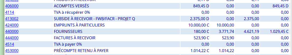 | Description | Le dossier est non assujetti mais je crois avoir essayer certains trucs en le mettant temporairement en assujetti, par exemple des factures TVAC en mettant la TVA à 0%. Du coup, le poste TVA 0% a été «utilisé» à ce moment-là mais pour un montant nul. Maintenant, quand j'affiche la balance, apparaissent les deux postes alors qu'ils n'ont été ventilé ni au débit ni au crédit. Voir image jointe. | ||||