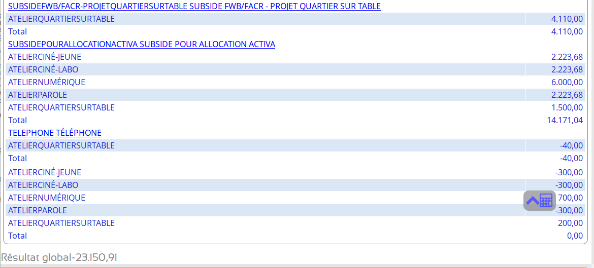 Il vaut mieux me dire où cela se trouve : j'ai perdu 10 minutes à chercher :-( Etape pour reproduire : Allez dans ANCBCC , Balance Comptabilité Analytique / Comptabilité , comparer les totaux dans Fiche/Activité et Activité / Fiche , Activité / Poste comptable , ... Totaux Incorrects : Poste Comptable / Activité Activité / Fiche |