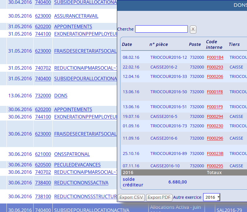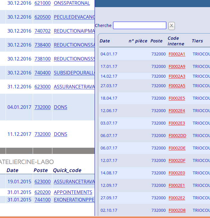 | Description | Je m'étais déjà posée la question quant à la pertinence d'un telle option. Et là, en passant et en la voyant en acte dans la CA, je me dis que ce pourrait être une proposition à soumettre: 1) En CA, comme rapporté dans un bogue précédent, quand on affiche l'historique d'une activité, seul l'exercice en cours («préférence») est affiché et accessible. L'historique d'une fiche, lui, laisse la possibilité de choisir (menu déroulant) un autre exercice. 2) De plus, l'exercice affiché est celui de la date de l'opération concernée par la ligne dans laquelle se trouve la fiche sur laquelle on clique, et non celui de «préférence». Voir images jointes: dans la même recherche (GL), si je clique sur la fiche «DONS» pour une opération en 2016, c'est l'exercice 2016 qui s'affiche, et si, un peu plus bas dans la liste, je clique sur la fiche «DONS» pour une opétation en 2017, c'est 2017 qui s'affiche. 3) De plus, si on choisi un autre exercice dans le menu déroulant, alors l'exercice premièrement affiche reste celui de référence: soit l'affichage va jusqu'à cet exercice (si exercice antérieur choisi), soit il commence à celui-ci (si exercice postérieur choisi). 4) Il semblerait que ce comportement ne soit pas cohérent sur tous les menus: si l'historique d'une fiche est affiché depuis le grand livre (ANC/ANCIMP/ANCGL), alors le comportement décrit ci-dessus est d'application; par contre, s'il est affiché depuis l'historique général (ANC/ANCIMP/ANCHOP), alors c'est l'exercice en cours («préférence») qui est affiché -- toujours avec possibilité de changement (menu déroulant). Proposition: Puisque le grand livre, l'historique ou autres impressions sont données selon la fourchette de dates du filtre, le comportement le plus pratique ne serait-il pas d'afficher les historiques (de fiche, de poste et d'activité) pour les exercices choisis selon cette fourchette plutôt que selon l'exercice en cours dans «préférence» ou selon "la date à laquelle on clique sur la fiche", toujours en gardant la possiblité de changer (menu déroulant)? Sinon, généraliser le comportement actuel du GL qui est aussi intéressant : afficher l'exercice de "la date à laquelle on clique sur la fiche", avec celui-ci comme "pivot" (jusque là ou depuis là -- voir point 3 ci-dessus). | ||||