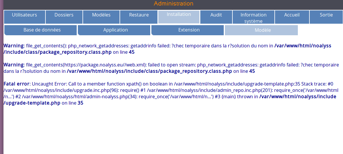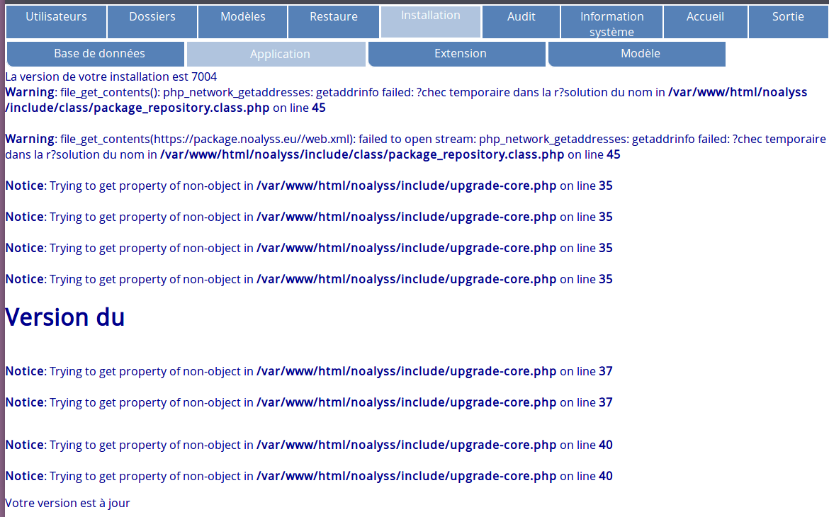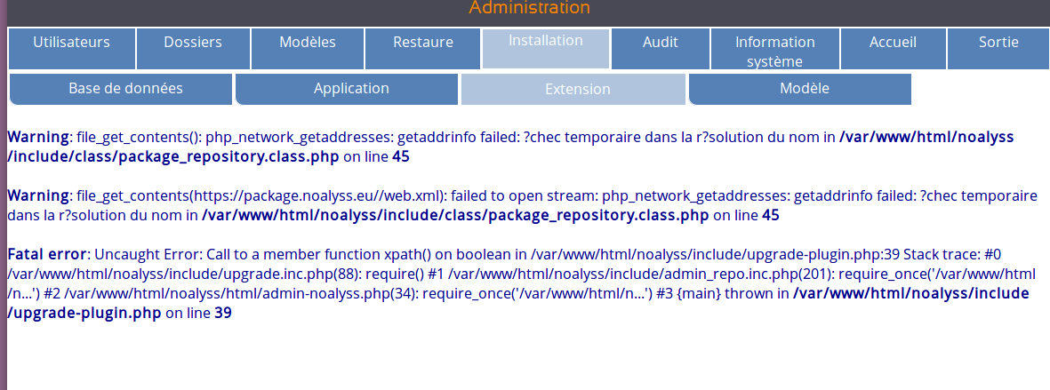 Le problème vient de ton serveur noalyss, il n'a pas pu résoudre le nom package.noalyss.eu. Malheureusement, comme l'erreur n'est que chez toi, il n'est pas possible de réparer. PS : je te conseille fortement de pas être en mode DEBUG , sur ton système de PROD |