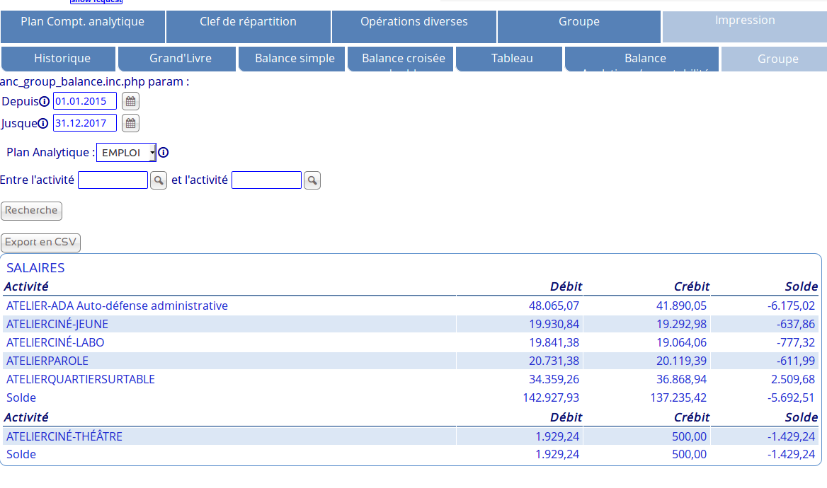 | Description | Dans les plans comptables analytiques (ANC/PLANANC), le groupe auquel appartient une activité n'est pas affiché dans la liste; il y a «--» à toutes les lignes. Exemple ci-joint: cinq ateliers appartiennent au groupe «SALAIRES» et sont classés ainsi dans l'impression mais cette appartenance n'apparaît pas dans le PCA. | ||||