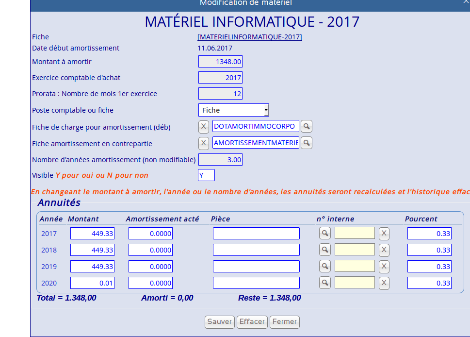 | Description | Voir ci-joint: amortissement sur quatre ans au lieu de trois et résidu. | ||||