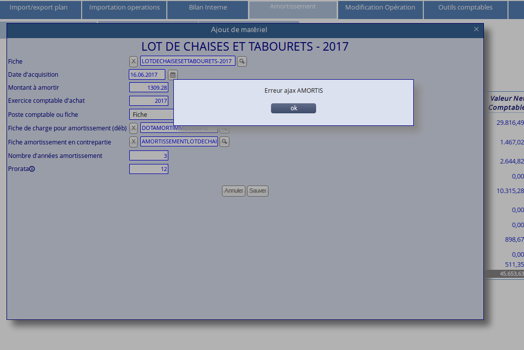 | Description | Quand on ajoute une fiche à amortir: erreur ajax mais la fiche est ajoutée quand même. | ||||