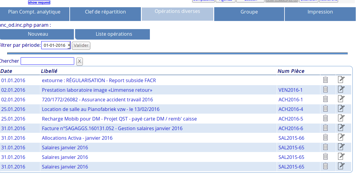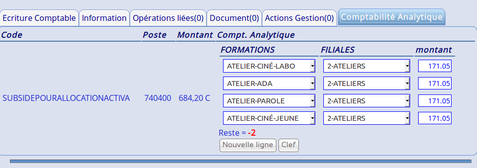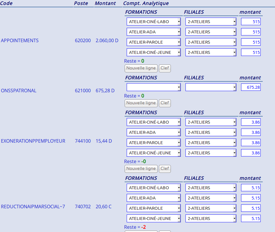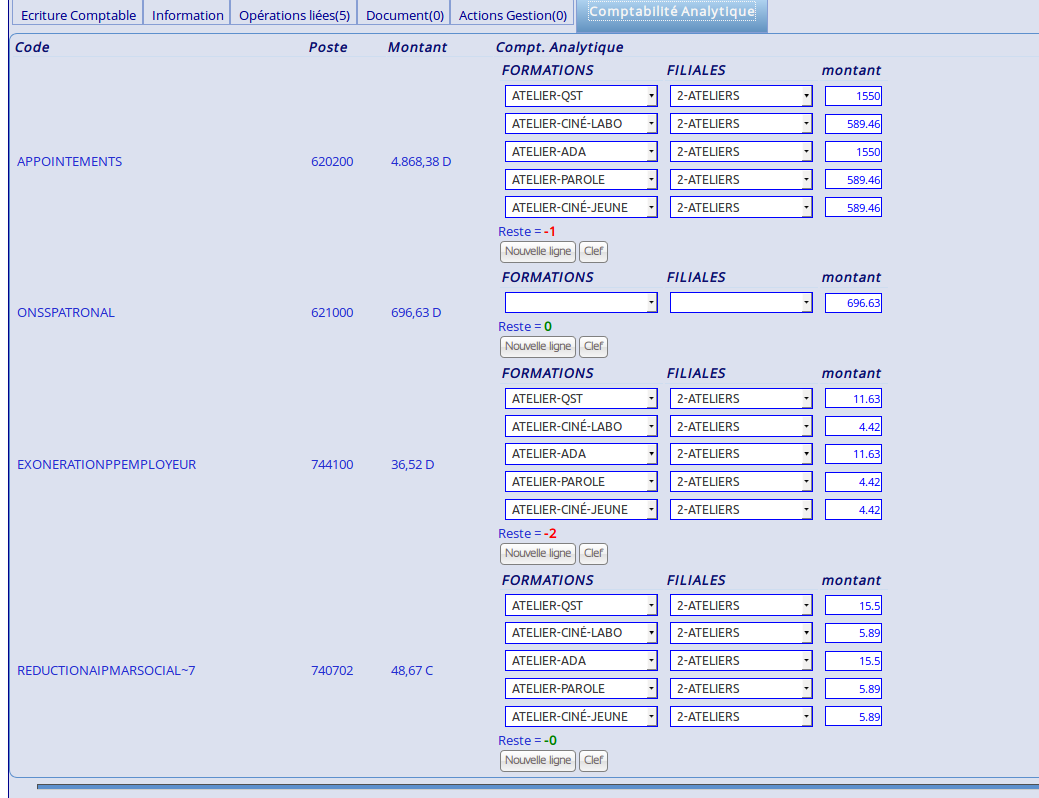 | Description | Il arrive que le calculs du total de la ventilation d'un poste en CA se fasse de travers. Le montant est ventilé correctement et entièrement mais, après ouverture de l'onglet CA d'un opération, un reste apparaît bien que tout le monant soit ventilé. Ci-joint: 1 - liste d'opération dans le menu CA. 2- modification d'une OD de salaire et ouverture de l'onglet CA: il apparaît des reste (en rouge) alors que le total est correct. Du plus, si je clique sur la bouton «vérifier imputation analytique», tout est vert. | ||||