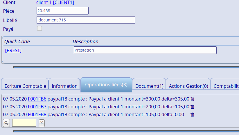 | Description | Prenons une vente et ses opérations liées. Dans l'onglet "Opérations liées" on trouve le listing des opérations et un delta entre l'opération précédente et la suivante. Dans le cas d'une vente de plusieurs produits. Il semble que le delta ne se calcule que sur la dernière ligne de la vente et non sur le total. Une vente de 2 articles (220+450=670), liée à un paiement partiel de 200 : le delta est de 250, ce qui correspond à 450-200 et non de 670-200=470 auquel j'aurais pu m'attendre. | ||||