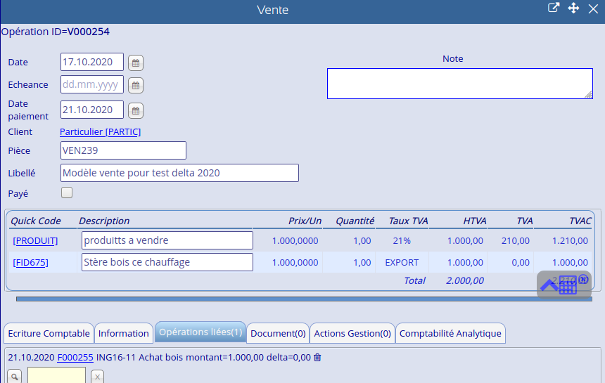Bonjour Dany, Pour reproduire le problème, il faut par exemple plusieurs articles dans une même vente. Il ne sera pris en compte que du dernier article de la liste. J'ai refait le test sur le site de démo https://demo.noalyss.eu pour une vente V000254 avec un paiement F000255 [PRODUIT] 1.000,0000 1,00 21% 1.000,00 210,00 1.210,00 [FID675] 1.000,0000 1,00 EXPORT 1.000,00 0,00 1.000,00 Total 2.000,00 2.210,00 21.10.2020 F000255 ING16-11 Achat bois montant=1.000,00 delta=0,00 |