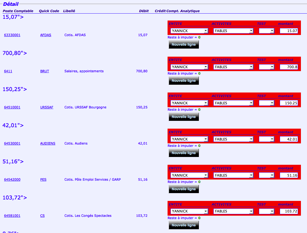 | Description | J'ouvre l'écriture de salaire en mode pop up, je ne touche aucun montant donc il les laisse tels qu'ils ont été enregistrés à l'origine. Lorsque que je sauve, phpcompta m'indique tout les montant en rouge avec un "Désolé les montants pour la comptabilité analytique sont incorrects" | ||||