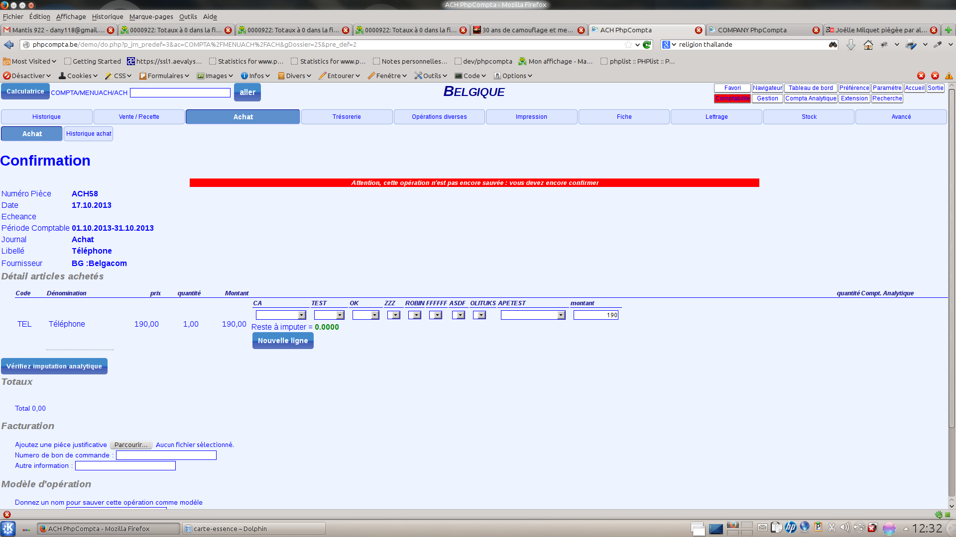 | Description | La ligne TOTAUX de la seconde page de l'encodage des factures reste à 0.00 qu'il y ait une ou plusieurs lignes encodées lorsque la fonctionnalité "Analytique" n'est pas paramétrée. Les totaux sont corrects lorsque cette dernière est activée. | ||||